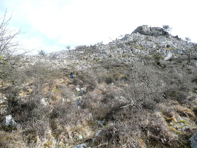 Según veníamos para aquí hemos visto por donde bajaban de la cima cuatro montañeros que nos han precedido, así que sin mirar más, nos hemos metido tripa arriba sin sendero claro, al menos yo no lo he visto. Ni sendero, ni marcas ni hitos ni nada. Subes poniendo las manos donde haga falta, eso si sin riesgos y, como decía el otro “al final llegas arriba”.